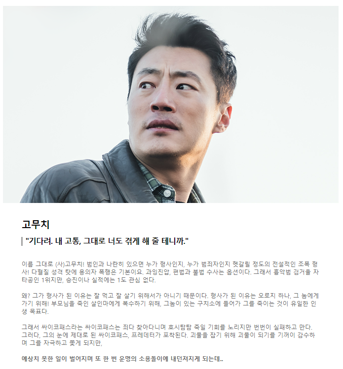 아래는 대표 등장인물인 정바름(이승기) X 고무치(이희준)의 소개와